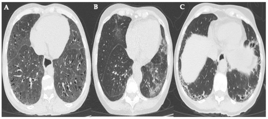 High-resolution axial computed tomography images with different patterns of ILD (Source: Radiology department of Ramon y Cajal’s Hospital). The images show patterns of non-specific fibrotic interstitial pneumonia (A,B), highlighting the presence of ground-glass opacities and traction bronchiectasis. Image (C) shows usual interstitial pneumonia, where the previous findings and a pattern of honeycombing can be seen. The dilated esophagus suggests ILD related to connective tissue disease rather than idiopathic pulmonary fibrosis.