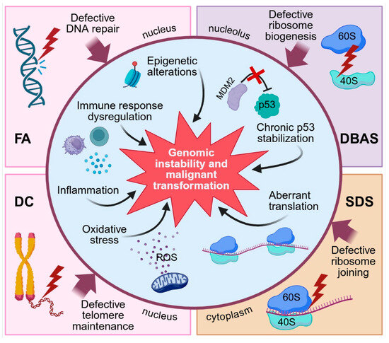 | Shwachman–Diamond Syndrome | SBDS, EFL1, DNAJC21, SRP54 [30] | Ovarian, breast, pancreatic cancer; dermatofibrosarcoma, esophageal squamous cell carcinoma, peritoneal carcinoma [17,31,32,33,34]. |
