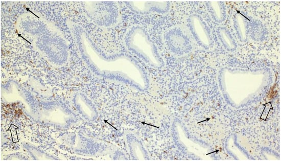 - Russell, P.; Sacks, G.; Tremellen, K.; Gee, A. The distribution of immune cells and macrophages in the endometrium of women with recurrent reproductive failure. III: Further observations and reference ranges. Pathology 2013, 45, 393–401. [Google Scholar] [CrossRef] [PubMed]