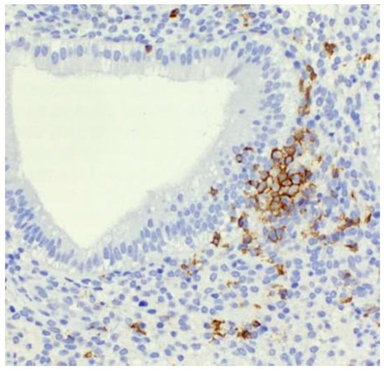 Details on the periglandular uterine NK cells cluster—immunohistochemistry with anti-CD56 antibody, Magnification 400×.