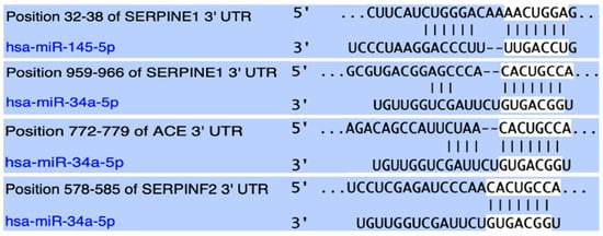 Both studied miRNAs were found to hold conserved binding sites in the 3′-UTR of the SERPINE1 gene with perfect complementarity and have been experimentally shown to negatively regulate its expression through direct experiments. Between these two SERPINE1 regulators, miR-34a was bioinformatically shown to form an even more stable complex and also appeared to target the mRNA of the ACE gene and negatively regulate its expression. Lastly, miR-34a was predicted to strongly target the mRNA of the SERPINF2 gene, which codes for α2-antiplasmin, the main inactivator of fibrinolytic plasmin [,] (Figure 1).
