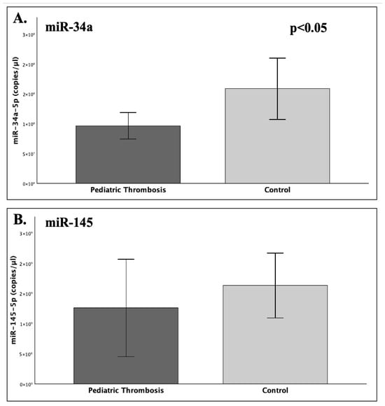 The graphs depict the mean expression (copies/μL) of (A) miR-34a-5p and (B) miR-145-5p that was measured in serum samples of pediatric patients with thrombosis (1–18 months post-incident) and healthy controls. It was shown that miR-34a was significantly downregulated (p = 0.029) in the patient population compared to controls, while the expression of miR-145-5p exhibited no statistical difference between the two groups.