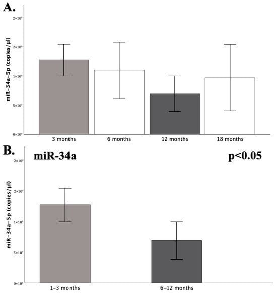 Graphs depicting the mean expression (copies/μL) of miR-34a-5p (A) across the four defined groups of post-thrombotic time and (B) between the 1–3- and 6–12-month groups, which differed significantly in the expression of miR-34a. Statistical significance was set at p < 0.05.