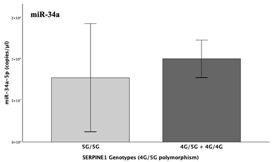 Bars depicting the mean expression (copies/μL) of miR-34a-5p across genotypic groups for the 4G/5G functional polymorphism of the SERPINE1 gene, which increases the expression of PAI-1 in presence of the 4G allele.