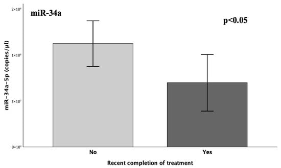 The graphs depict the mean expression (copies/μL) of miR-34a-5p between patients who had recently completed a treatment regimen (1–3 months) and patients either actively receiving or having long-term terminated treatment courses. Statistical significance was set at p < 0.05.