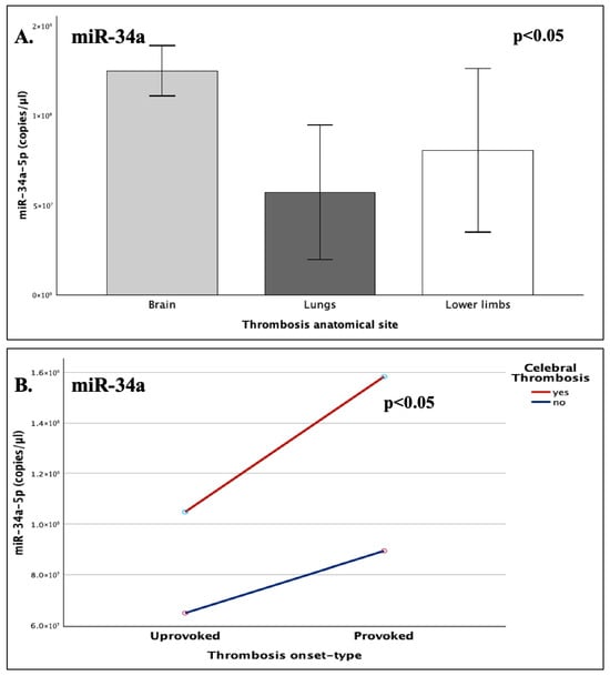 The graphs present the expression (copies/μL) of (A), miR-34a-5p across different anatomical sites, where the respective thrombi were developed, including cerebral thrombosis (brain), pulmonary embolism (lung), and lower-limb thrombosis; and (B), miR-34a-5p under the combined influence of cerebral involvement and onset-type (provoked/unprovoked).