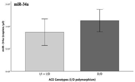 Graph illustrating the expression (copies/μL) of miR-34a-5p across genotypic groups for the I/D functional polymorphism of the ACE gene, which increases the levels and enzymatic activity of circulating ACE in presence of the D allele, thus indirectly upstream increasing PAI-1 levels.