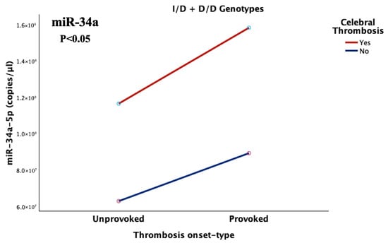 Diagrammatic representation of miR-34a-5p expression under the combined effect of thrombosis site (cerebral/other) and episode onset-type (provoked/unprovoked) in patients carrying at least one D allele for the ACE-I/D polymorphism (I/D and D/D genotypes). Trauma-induced (provoked) cerebral cases exhibited significantly elevated miR-34a levels compared to the respective unprovoked cases and to thrombotic episodes of any onset-type in other anatomical locations (p = 0.035).