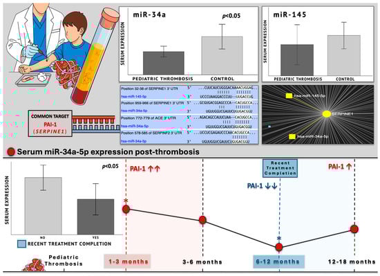 Graphical abstract of study design and key findings upon miR-34a expression in pediatric post-thrombotic course, as well as visualized outputs from target-prediction in silico analyses (TargetscanHuman, miRNet) presented alongside experimental results. Bioinformatic analyses revealed. Target-prediction analyses yielded that miR-145-5p and miR-34a-5p hold conserved binding sites on the 3′-UTR of SERPINE1 (PAI-1) mRNA, both scoring perfect complementarity of the miRNA seed region, while in the case of miR-34a, mRNA binding exhibits possibly increased stability due to the presence of an adenine, opposite to miRNA position 1 of the seed sequence. MiR-34a additionally holds 7/7 binding sites on the 3′ UTR of the mRNA of the ACE gene, which codes for the upstream positive regulator of PAI-1, as well as on the mRNA of the SERPINF2 gene that codes for the anti-fibrinolytic α2-antiplasmin. The expression of miR-34a was significantly decreased in patients compared to controls, while no difference was observed for the levels of miR-145 between the two studied cohorts. The lower panel presents a combinatory graph that illustrates the expressional trajectory of miR-34a across the post-thrombotic course with a peak at 1–3 months post-thrombosis, a time when PAI-1 is anticipated to be significantly increased. Its expression follows a gradual decline and finally a nadir, shortly after treatment completion, when PAI-1 has been demonstrated to diminish. At the long-term post-thrombotic stage of 12–18 months, where PAI expression is expected to recover, miR-34a shows a slight, non-significant increase reaching lower levels than those of the studied controls. These findings are indicative of a dynamic yet impaired regulatory relationship between miR-34a and SERPINE1, as well as its upstream controller ACE. Hence, the downregulation of miR-34a in pediatric thrombosis might possibly lead to deficient fibrinolytic capacity through the inadequate suppression of the anti-fibrinolytic ACE/PAI-1 axis, the upregulation of which is critical for thrombosis development. Arrows are used for the indication of PAI-1 fluctuations at certain points of the post-thrombotic course, representing upregulation (upward arrow) and downregulation (downward arrow), while asterisks denote statistically significant differences in miR-34a expression between post-thrombotic time intervals.