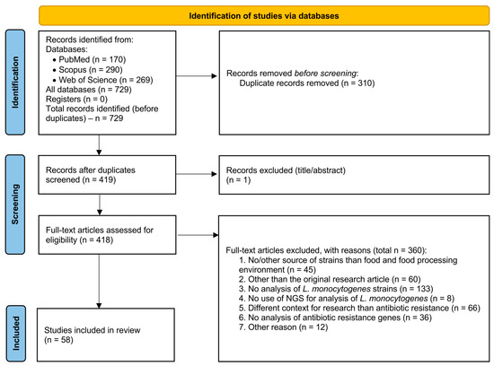 The following criteria were used as exclusion criteria: (1) no/other source of strains than food and food-processing environment; (2) other than the original research article; (3) no analysis of L. monocytogenes strains; (4) no use of NGS for the analysis of L. monocytogenes; (5) different context for research than antibiotic resistance; (6) no analysis of antibiotic resistance genes; and (7) another reason. Search terms “Listeria monocytogenes” OR “L. monocytogenes” AND “next generation sequencing” AND “resistance” OR “Listeria monocytogenes” OR “L. monocytogenes” AND “whole-genome sequencing” AND “resistance”. After removing duplicate records from the databases, 418 results were obtained, of which 58 met the inclusion criteria. The database search and literature analysis identified key original research studies focusing on the use of next-generation sequencing in predicting antibiotic resistance for L. monocytogenes strains isolated from food and food-production environments (Table 1) [8,12,14,15,16,17,18,19,20,21,22,23,24,25,26,27,28,29,30,31,32,33,34,35,36,37,38,39,40,41,42,43,44,45,46,47,48,49,50,51,52,53,54,55,56,57,58,59,60,61,62,63,64,65,66,67,68,69]. Data items: country, year of sample collection, sample type (food/processing environment), number of isolates, sequencing platform, bioinformatics pipeline, phenotypic resistance testing, and resistance genes detected (Table 1 and Table S1 and Figure S1).