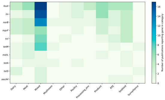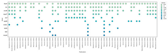 Based on a literature search following previously established criteria, the fifteen resistance genes most frequently detected in L. monocytogenes were identified through next-generation sequencing. Sequencing not only enables the simultaneous detection of all known genetic determinants of antibiotic resistance but also allows for the assessment of their prevalence in populations isolated from food and food-production environments. The articles shown in Figure 2 report the prevalence of genes such as fosX, lin, norB, mprF, sul, tetM, mdrL, tetA, aacA4, tet, msrA, lde, tetS, fexA, and mepA, which exhibited the highest detection rates in various studies. By compiling the results from these studies, we can identify which resistance mechanisms are most common in the food sector. An overview of the genetic profiles, including the number and percentage of strains with each gene in each study, provides a foundation for further risk analysis and the development of predictive models for phenotypic resistance based on NGS data.