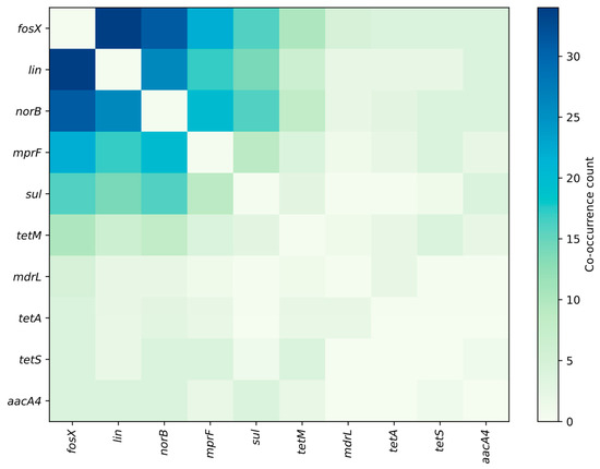 Frequency matrices for the detection and co-occurrence of resistance genes (top 10 genes).