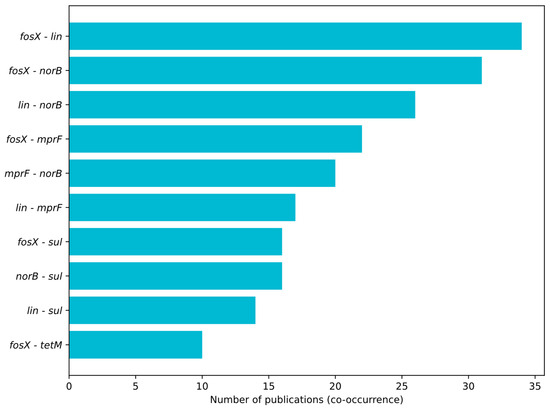 Figure 4, Figure 5 and Figure 6 summarize the frequency and co-occurrence patterns of the top ten resistance genes across the surveyed publications. The co-occurrence matrix (Figure 4) displays the number of publications in which gene pairs were detected together; the strongest and most frequently reported pairings are fosX–lin, fosX–norB, and lin–norB. The gene-sample heatmap (Figure 5) shows the distribution of detections across sample categories and indicates that the greatest number of reports for fosX, lin, and norB originate from meat-related samples, while other sample types yield fewer but still notable detections. The bar chart of the top ten co-occurring gene pairs (Figure 6) ranks pairs by the number of publications reporting their simultaneous presence, with fosX–lin at the top, followed by fosX–norB, lin–norB, and additional frequent combinations involving mprF and sul. Collectively, these figures present a clear, publication-based picture of which resistance determinants and gene combinations are most commonly reported in L. monocytogenes from food and production environments, supporting targeted surveillance and comparative analyses of resistance prevalence.