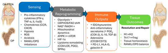 MSCs are key players in musculoskeletal tissue regeneration due to their adaptive immunomodulatory property [12]. They sense inflammatory and damage-associated cues across joint, tendon, muscle, and marrow niches and rapidly adopt regulatory states that contain injury, promote resolution, and support structural repair [40] (Figure 1). This adaptability, more than lineage markers per se, drives in vivo performance across musculoskeletal conditions. In OA and PTOA, synovial fluid and peri-articular tissues exhibit persistent low-grade inflammation with hypoxic and oxidative stress that impedes resolution [41]; rheumatoid arthritis and chronic tendinopathies instead exhibit higher inflammatory tone with maladaptive stromal–immune loops [42]. By contrast, OP features chronic, low-grade inflammation characterized by estrogen deficiency and glucocorticoids, skewing the marrow niche toward osteoclastogenesis [43]. In all cases, the real-world efficacy of MSCs in musculoskeletal disorders hinges on how they sense local signals and reprogram their metabolism and secretome into a pro-resolving configuration via pattern-recognition receptors.