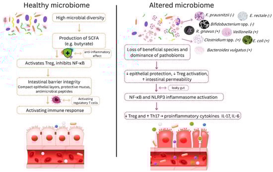 The contrasting microbial profiles observed in individuals who recover fully after SARS-CoV-2 infection versus those who develop long COVID. Patients who recover typically demonstrate restoration of a balanced gut microbiota, with microbial diversity and relative abundances resembling those of healthy, uninfected controls. In contrast, individuals with long COVID exhibit persistent dysbiosis characterized by reduced alpha diversity and depletion of beneficial, short-chain fatty acid–producing taxa such as Faecalibacterium prausnitzii, Eubacterium rectale, and Bifidobacterium spp. Concurrently, there is an enrichment of proinflammatory and opportunistic pathobionts, including Ruminococcus gnavus, Bacteroides vulgatus, Veillonella, and certain Clostridium species. These taxonomic shifts have been associated with chronic low-grade inflammation, impaired intestinal barrier integrity, and prolonged systemic symptoms. The visually specified taxa represent the species whose alteration has been most consistently reported in multiple clinical studies investigating dysbiosis associated with long COVID, particularly in the chronic period of 3–6 months post-infection. The schematic representation of the altered gut microbiome (bottom right) illustrates the loss of epithelial barrier integrity, evidenced by widened intercellular spaces (“leaky gut”), and increased inflammatory cell infiltration into the lamina propria, resulting from the activation of the NF-κB and NLRP3 pathways, emphasizing the inflammatory state and increased permeability. Abbreviations: SCFA, short-chain fatty acid; Treg, regulatory T cell; NF-κB, nuclear factor kappa-light-chain-enhancer of activated B cells; NLRP3, NOD-, LRR-, and pyrin domain-containing protein 3; Th17, T helper 17 cells; IL-17, interleukin-17; IL-6, interleukin-6; −: decrease; +: increase; ↑: increase; ↓: decrease [,,].
