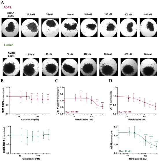 Narciclasine (1 mg; MedChemExpress, Monmouth, NJ, USA) was dissolved in sterile dimethyl sulfoxide (DMSO) (Sigma-Aldrich Chemie GmbH, Buchs, Switzerland) to generate a 1 mM stock solution. Working concentrations of Narciclasine (400 nM, 200 nM, 100 nM, 50 nM, 25 nM and 12.5 nM) were prepared by diluting the stock solution in complete RPMI medium with 1% heat-inactivated FBS. After 3 days of culture, A549, LuCa1, MSTO-211H, and H2052/484 spheroids (3000 and 1500 cells/spheroid) were incubated with Narciclasine at the indicated concentrations for 72 h. Negative control spheroids were incubated for 72 h in RPMI + 1% FBS medium containing 0.08% DMSO (corresponding to the final DMSO concentration in all Narciclasine treatments). Positive cytotoxic control spheroids were incubated for 72 h in RPMI + 1% FBS medium containing 0.1% Triton X-100 (AppliChem, Darmstadt, Germany).