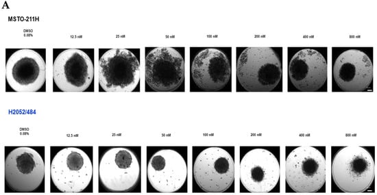 Human cell lines A549 and MSTO-211H were purchased from the American Type Culture Collection (Manassas, VA, USA). LuCa1 is a cancer cell line established and characterized in the laboratory [] from a 79-year-old woman diagnosed with untreated stage IV LUAD. H2052/484 cells were derived in the laboratory from H2052 cells []. Briefly, 1 × 106 H2052 cells were implanted in the thoracic cavity of Nude-Foxn1nu nu/nu athymic mice. The orthotopic tumor was explanted and mechanically dissociated 102 days later to produce the H2052/484 cell line. All cell lines were cultured in Roswell Park Memorial Institute (RPMI) 1640 (Life Technologies, Carlsbad, CA, USA) supplemented with 10% (v/v) heat-inactivated fetal bovine serum (FBS), 10 mM HEPES, and 100 U/mL-100 µg/mL Penicillin-Streptomycin (Sigma-Aldrich Chemie GmbH, Buchs, Switzerland) (complete RPMI). To produce spheroids, after trypsinization, MSTO-211H and H2052/484 cells were seeded in Akura™ 96- or 384-well Spheroid Microplates (InSphero, Schlieren, Switzerland) at 1500 cells per well. LuCa1 and A549 cells were seeded at 3000 cells per well. All cells were cultured in complete RPMI at 37 °C in 5% CO2.