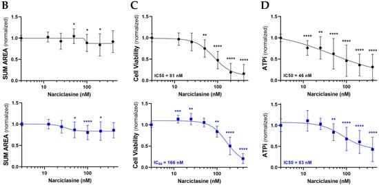 Spheroid size was quantified using the sum area parameter (sum) and normalized to untreated spheroids to account for variability in initial spheroid size. The effect of Narciclasine at 440 nM was independent of initial spheroid size (Figure S1), indicating that the accessibility of the molecule was similar across conditions. LUAD spheroids showed only minimal changes in sum (Figure 1B), while H2052/484 (MM) spheroids showed a dose-dependent decrease (Figure 2B). These data suggest that Narciclasine induces partial disintegration of LUAD and MM spheroids, disrupting their compact form and promoting dispersion of dead cells around the spheroids, with a greater effect on MM spheroids.