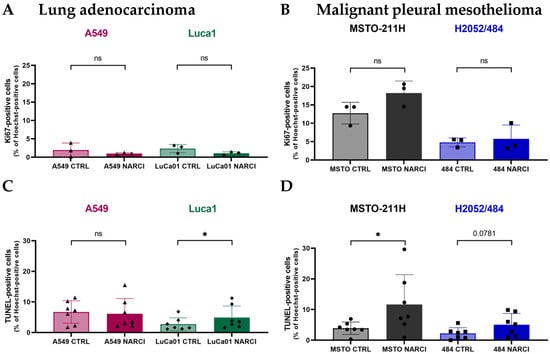 Effects of Narciclasine on cell proliferation and apoptosis in LUAD and MM spheroids. (A,B) Quantification of proliferating cells based on the percentage of Ki-67-positive cells over total Hoechst-stained nuclei in LUAD (A) and MM (B) spheroids treated with 50 nM Narciclasine for 72 h. (C,D) Quantification of apoptotic cells based on percentage of TUNEL-positive cells over total Hoechst-stained nuclei in LUAD (C) and MM (D) spheroids after 72-h treatment with 50 nM Narciclasine. Data are normalized to untreated control (CTRL) spheroids and presented as mean ± standard deviation of three biological replicates. Two-tailed paired t-test statistical analysis was performed, comparing the effect on cells in the presence (NARCI) and absence (CTRL) of Narciclasine. ns—p ≥ 0.05; * p < 0.05.