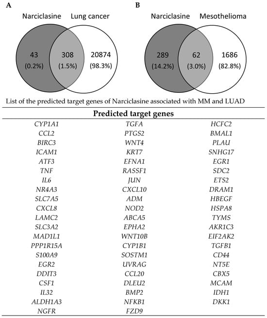 Bioinformatics identification of Narciclasine gene targets. Determination of the number of common targets between Narciclasine and lung cancer (A), and Narciclasine and MM (B). List of the predicted target genes of Narciclasine associated with both MM and LUAD.