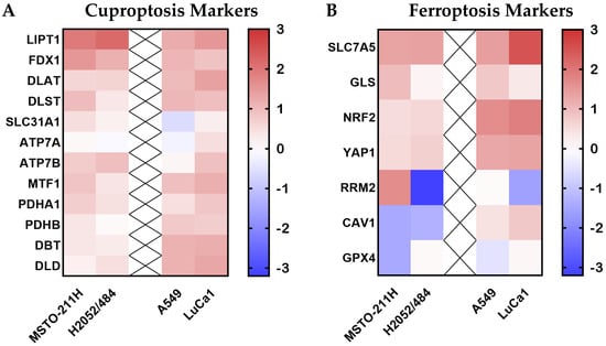 To explore this, we assessed the expression of 19 markers associated with ferroptosis and cupropotisis pathways in the four cell lines (MSTO-211H, H2052/484, A549, and LuCa1) treated or not for 72 h with 50 nM of Narciclasine. In both MM cell lines, most markers were upregulated after Narciclasine treatment (Figure 5, Figures S5 and S7), with the most notable fold increases observed for LIPT1 (3.8-fold in MSTO-211H, 4.5-fold in H2052/484), FDX1 (2.9-fold in MSTO-211H, 2.2-fold in H2052/484), and SLC7A5 (2.5-fold in MSTO-211H, and 2.6-fold in H2052/484). In contrast, CAV-1 expression was downregulated in both MM cell lines, with a fold decrease of 0.44 in MSTO-211H and 0.47 in H2052/484.