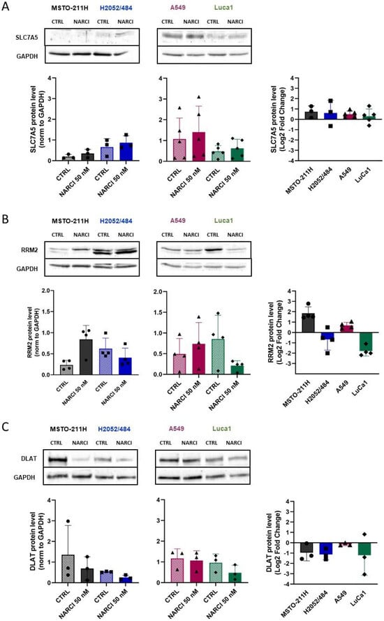 To confirm transcriptional changes at the protein level, we analyzed the expression of three markers by western blot: SLC7A5, a ferroptosis marker upregulated in all four cell lines; RRM2, a ferroptosis marker differentially regulated across MM and LUAD cell lines; and DLAT, a cuproptosis marker upregulated in all four cell lines. As shown in Figure 6A, both MM cell lines expressed undetectable or very low levels of SLC7A5 protein. Basal SLC7A5 levels were higher in LUAD cells, especially in A549. Narciclasine treatment, however, did not significantly affect SLC7A5 protein levels. This discrepancy between mRNA and protein levels for SLC7A5 may reflect translational inhibition of mRNA. RRM2 protein levels mirrored transcriptional-level changes: increased in MSTO-211H cells, decreased in the H2052/484 and LuCa1 cells, and unchanged in A549 cells (Figure 6B). DLAT protein expression was slightly reduced in three of the four cell lines despite upregulated mRNA (Figure 6C), suggesting possible inhibition in translation of mRNA and/or enhanced proteosomal degradation.