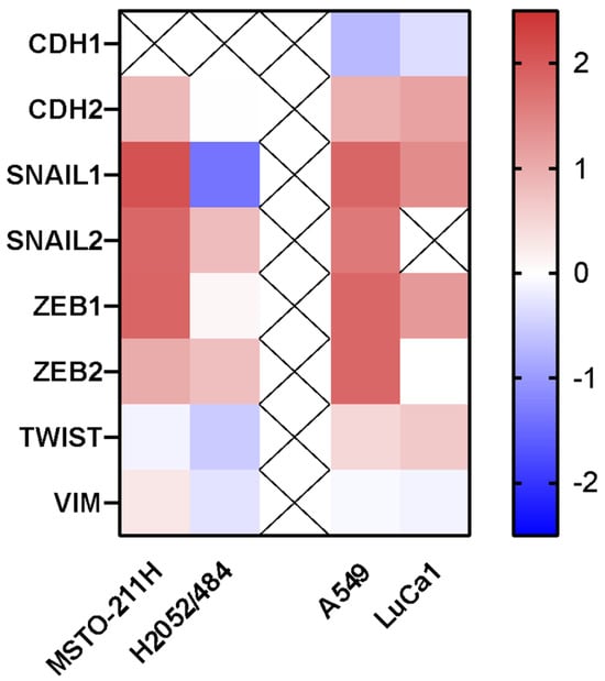 Effects of Narciclasine on the expression of epithelial-to-mesenchymal (EMT) markers. Heatmap showing Log2 fold changes in mRNA expression of EMT markers in MM and LUAD cells following 72 h of treatment with 50 nM Narciclasine.