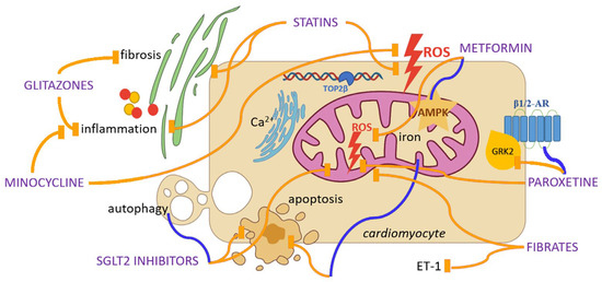 Thiazolidinediones have been shown to improve LV function in mouse models of HF following myocardial infarction (MI) [128] and to reduce the risk of major adverse cardiovascular events in patients with insulin resistance [129]. Moreover, one study demonstrated that pioglitazone exerted a protective effect against DOX-induced nephropathy in rats by mitigating profibrotic and inflammatory mechanisms [130]. Premedication with pioglitazone partially prevents LV dysfunction in both the acute and chronic phases in mice treated with DOX, suggesting that it may be a novel therapeutic strategy for cardioprotection in DIC. Nevertheless, the molecular basis of pioglitazone’s cardioprotective effects in DOX-induced LV dysfunction is still poorly understood [131].