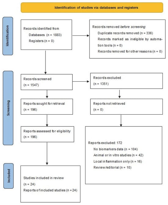 The literature search identified a total of 1883 records. After removal of duplicates, 1547 unique studies remained for title and abstract screening. Two reviewers independently screened all titles and abstracts retrieved by the search. Of these, 1351 were excluded as irrelevant to the inclusion criteria. The remaining 196 full-text articles were assessed for eligibility using the predefined inclusion and exclusion criteria. Disagreements were resolved by consensus. Reasons for exclusion at the full-text stage were recorded and are summarized in Figure 1. Of the 172 full-text articles excluded, 104 lacked biomarker data, 42 involved animal or in vitro models, 16 focused on local wound inflammation without systemic outcomes, and 10 were reviews or editorials. No automation tools were used in the screening process; therefore, this category in the PRISMA flow diagram is not applicable (n = 0). The higher number of animal or in vitro studies excluded reflects a stricter reclassification applied during the revised screening process, in accordance with the refined eligibility criteria.