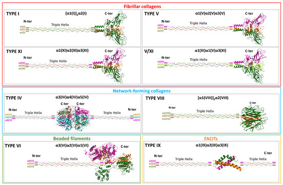 In the following paragraphs, available structural data are reported by grouping these collagens according to their global properties (fibrillar, network-forming, beaded filaments forming, and FACITs).