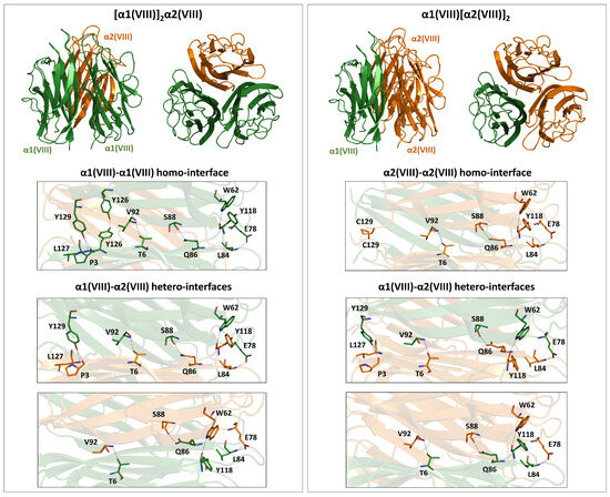 In the widely diverse modes in which collagen manifests, types IV, VIII, and X are classified in the network-forming group as they form open networks rather than fibers [37,56]. These collagens provide molecular scaffolds and interact with cells, growth factors, and other basement membrane components such as laminin, nidogen, and perlecan [57]. Here, the attention is focused on the structural organization of the NC1 domains of types IV and VIII, which associate as heterotrimers.