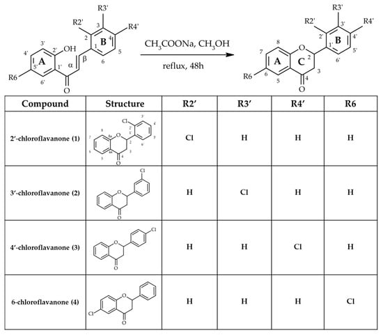 The initial phase of research focused on producing four chlorine-substituted flavanones: 2′-chloroflavanone, 3′-chloroflavanone, 4′-chloroflavanone, and 6-chloroflavanone. These chlorinated compounds were prepared through cyclization reactions of the corresponding 2′-hydroxychalcones containing chlorine substituents, using sodium acetate which acts as a base to deprotonate the 2′-hydroxyl group and facilitate the intramolecular cyclization reaction (Figure 2).