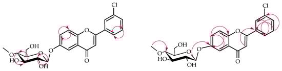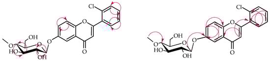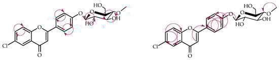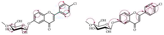 NMR spectroscopic characterization of compound 4a was performed, with spectral data summarized in Table 1 and Table 2 and essential COSY and HMBC connectivities depicted in Figure 10. The biotransformation yielded product 4a through glycosylation with a 4″-O-methylglucosyl unit, as demonstrated by the emergence of diagnostic signals for this substituent in both 1H and 13C NMR spectra (Supplementary Information: Figures S126 and S129). While ring A proton signals remained unchanged in the 1H NMR spectrum (compared to biotransformation substrate 4), ring B exhibited altered signals with characteristic multiples at δ = 7.51 ppm (H-2′, H-6′) and δ = 7.12 ppm (H-3′, H-5′), displaying an AA′BB′ coupling pattern diagnostic of 4′-substitution in the 6-chloroflavanone B-ring (Supplementary Information: Figure S126). HMBC analysis substantiated this assignment through key correlations between H-2′/H-6′ (δ = 7.51 ppm) and H-3′/H-5′ (δ = 7.12 ppm) with the shifted C-4′ signal (δ = 159.0 ppm). Furthermore, the anomeric proton H-1″ (δ = 4.98 ppm) showed correlation with C-4′ (δ = 159.0 ppm), confirming the glycosidic linkage position (Supplementary Information: Figure S139).