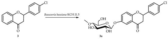 4′-Chloroflavanone (3) was biotransformed in culture of B. bassiana KCH J1.5 into 4′-chloroflavanone 6-O-β-D-(4″-O-methyl)-glucopyranoside (3a) yielding 5.8% (5.1 mg) (Figure 7).
