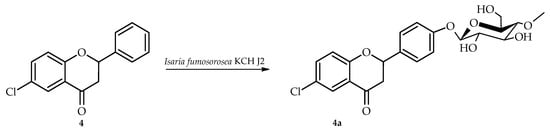 6-Chloroflavanone (4) was biotransformed in culture of I. fumosorosea KCH J2 into 6-chloroflavanone 4′-O-β-D-(4″-O-methyl)-glucopyranoside (4a) yielding 7.8% (6.8 mg) (Figure 9).