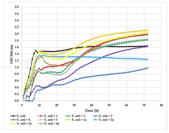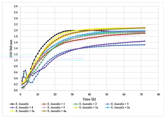 Biological assays were conducted on the obtained flavonoids to assess how structural modifications in the flavanone scaffold—specifically the addition of a chlorine substituent and a 4′-O-methylglucosyl group—influenced antimicrobial efficacy. Among the tested compounds, flavonoid aglycone 3 demonstrated the most pronounced antibacterial activity against the E. faecalis strain (Gram-positive) at 0.05% concentration with a ΔOD value of 1.11 compared to the control (bacterial strain without flavonoid treatment with ΔOD = 1.86). The remaining aglycones exhibited weaker inhibitory effects: compound 4 (ΔOD = 1.33), compound 1 (ΔOD = 1.56), compound 2 (ΔOD = 1.67), and flavanone without substituents 5 (ΔOD = 1.76). Notably, the corresponding glycoside derivatives (1a, 2a, 3a, 4a) showed no measurable inhibition of bacterial growth. The comparative growth profiles of E. faecalis in the presence of each test compound at 0.05% concentration are illustrated in Figure 11.
