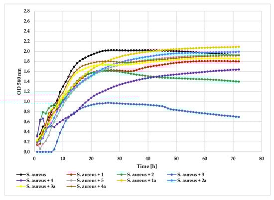 The effect of the action of compounds 1, 1a, 2, 2a, 3, 3a, 4, 4a, and 5 in concentration 0.05% on the growth of S. aureus ATCC 29213.
