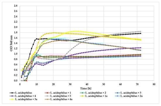 The effect of the action of compounds 1, 1a, 2, 2a, 3, 3a, 4, 4a, and 5 in concentration 0.05% on the growth of L. acidophilus ATCC 4356.
