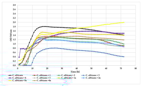 The effect of the action of compounds 1, 1a, 2, 2a, 3, 3a, 4, 4a, and 5 in concentration 0.05% on the growth of C. albicans ATCC 10231.