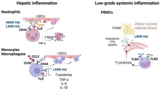 Proinflammatory role of hyaluronic acid (HA) in innate immune activation. (Left panel): In the hepatic sinusoid, HA activates neutrophils and monocyte-derived macrophages through CD44 and Toll-like receptors (TLRs), promoting cytokine release, endothelial adhesion, and migration across the sinusoidal barrier. It also amplifies reactive oxygen species (ROS) generation by inducing apoptotic cell death of neutrophils primed by tumor necrosis factor alpha (TNF-α). (Right panel): Systemically, low-molecular-weight HA (LMW-HA) activates peripheral blood mononuclear cells (PBMCs) via TLRs in the context of obesity-associated inflammation. Abbreviations: CCL2, C-C motif chemokine ligand 2; CCR2, C-C chemokine receptor type 2; CD44, lymphocyte homing receptor; DAMPs, damage-associated molecular patterns; FFAs, free fatty acids; HA, hyaluronic acid; HAS1, hyaluronan synthase 1; HMW-HA, high-molecular-weight hyaluronic acid; IL-1β, interleukin-1 beta; IL-6, interleukin-6; LMW-HA, low-molecular-weight hyaluronic acid; LSECs, liver sinusoidal endothelial cells; PBMCs, peripheral blood mononuclear cells; ROS, reactive oxygen species; SHAP, serum-derived hyaluronan-associated protein; TLR2, Toll-like receptor 2; TLR4, Toll-like receptor 4; TNF-α, tumor necrosis factor alpha. Created in BioRender. JCE Lab. (2025) https://BioRender.com/zxrl35j (accessed on 12 October 2025).