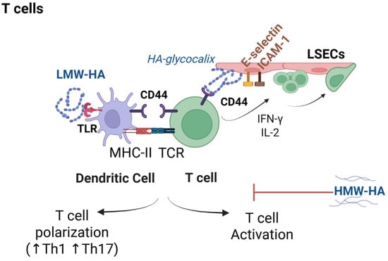 HA contributes to adaptive immunity from the earliest stages of T cell recruitment (Figure 2). A seminal study in mice published by deGrendele et al. demonstrated that HA expressed on the vascular endothelium facilitates CD44-dependent adhesion and transendothelial migration of activated T cells []. Subsequent studies have corroborated these findings in various models of chronic inflammation, including liver disease, where HA-CD44 interactions, either alone or in cooperation with adhesion molecules such as E-selectin and intracellular adhesion molecule-1 (ICAM-1), facilitate the infiltration and retention of effector T cells within inflamed tissues [,,] (Figure 2).