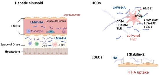 Understanding the role of HA in the liver requires consideration of the unique microarchitecture and composition of the hepatic ECM, which, unlike the dense interstitial ECM found in most organs, is relatively sparse, highly dynamic, and spatially compartmentalized []. The unique organization of hepatic architecture enables continuous and precisely regulated interactions among ECM components and diverse cell populations, supporting metabolic, immunological, and structural homeostasis. A key anatomical niche for these interactions is the space of Disse, a perisinusoidal compartment separating hepatocytes from the fenestrated LSECs. This space contains extracellular matrix molecules, including HA, collagen types IV and VI, fibronectin, laminins, and proteoglycans, as well as pro-fibrogenic HSCs and resident macrophages (KCs) []. Within this framework, as commented above, HA not only contributes to hydration and viscoelasticity, but also plays an essential regulatory role by interacting with cell surface receptors, such as CD44 and RHAMM, thereby modulating cell adhesion, migration, signaling, and responses to mechanical cues []. Specifically, HA is particularly enriched in the space of Disse, where it works as a dynamic interface between hepatocytes and LSECs, modulating multiple cell-specific functions. Among them, HA regulates the activation and migration of HSCs, supports KC adhesion and polarization, and affects the phenotype and immune responses of liver-resident and infiltrating macrophages via CD44-mediated signaling. Additionally, HA contributes to sinusoidal immune surveillance by interacting with immune cells such as T lymphocytes and dendritic cells (DCs), modulating their trafficking and activation states [,]. Particular attention should be paid to the unique phenotype and function of LSECs, which receive blood from both the portal vein and hepatic artery and serve as key regulators of hepatic vascular homeostasis. The pericellular matrix of LSECs, including a specialized HA-rich glycocalyx, is notably more complex and functionally versatile than endothelial cells in other anatomical locations of the body. This HA-enriched layer is critical in controlling sinusoidal permeability, mechanotransduction signaling in response to shear stress, and immune regulation. It also plays a direct role in antigen presentation and in mediating leukocyte rolling and adhesion via interaction with CD44 and other HA-binding receptors [].