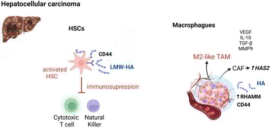 Finally, in the context of MASLD-associated fibrosis, upregulation of HAS2 in activated HSCs leads to excessive HA deposition within the fibrotic stroma. This accumulation fosters an immunosuppressive and pro-tumorigenic hepatic microenvironment by modulating extracellular matrix composition and immune cell infiltration (Figure 4). In vivo studies have shown that genetic or pharmacologic inhibition of HAS2 reduces stromal HA levels, alters the immune landscape, and significantly attenuates HCC growth, underscoring the HAS2-HA axis as a promising therapeutic target in liver cancer []. Although HCC can arise without cirrhosis in MASLD [], current data do not demonstrate consistent differences in HA fragment-size distributions or receptor expression profiles compared with cirrhotic HCC, and further systematic, etiology-stratified studies are needed.