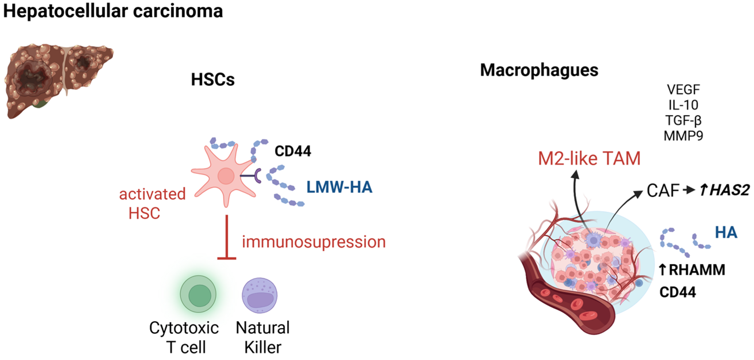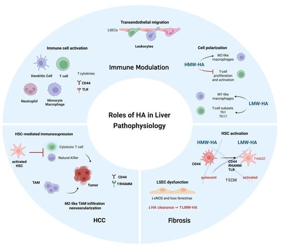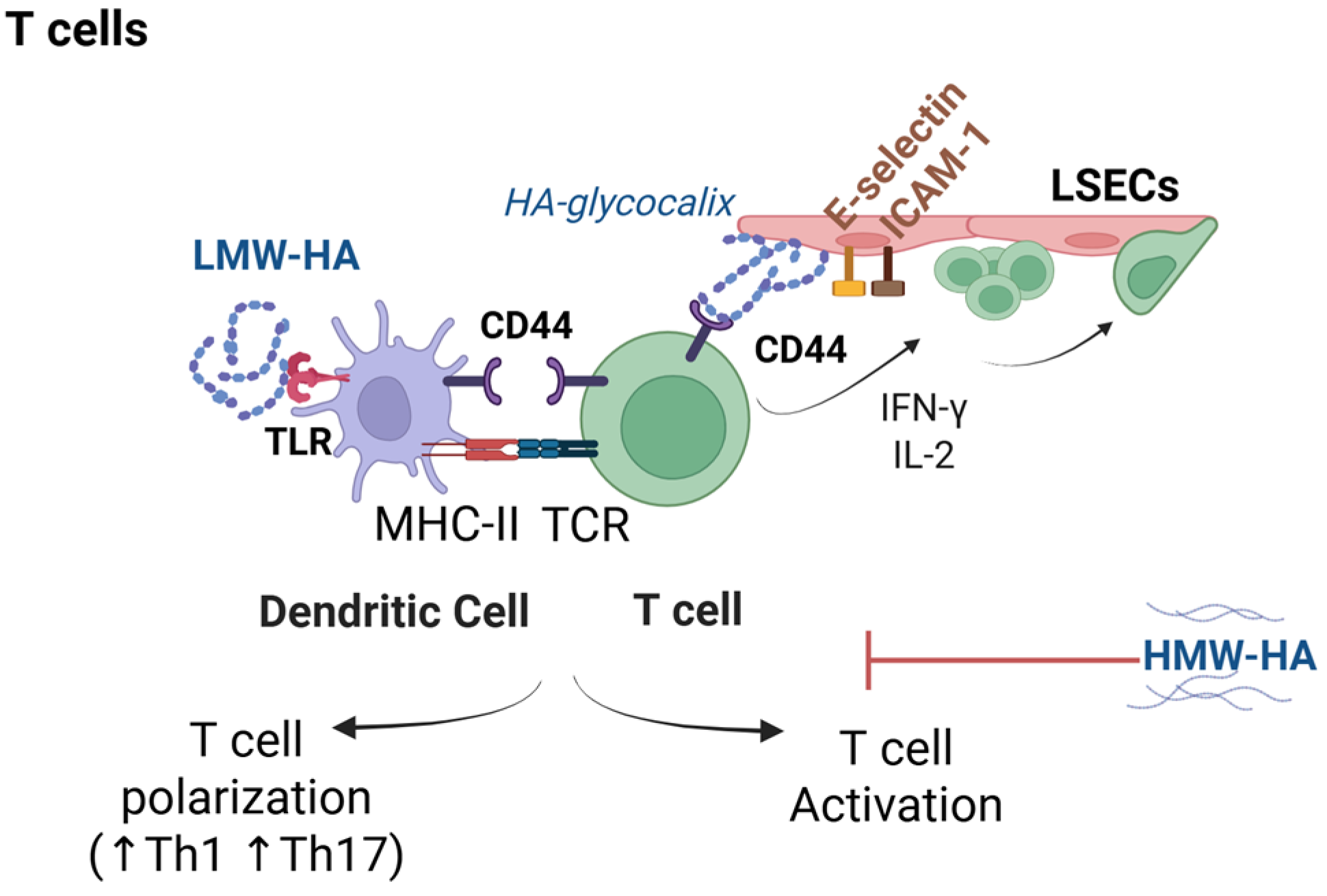 | CD44 | T cells, macrophages, HSCs, LSECs | Mediates HA-dependent cell adhesion, leukocyte recruitment, MDSC induction, T cell regulation | Binding affinity modulated by HA size and SHAPs | [11,12] |