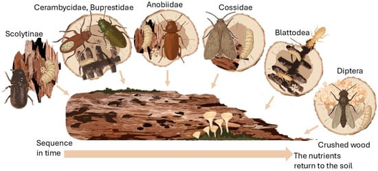 | Coleoptera | Curculionidae: Scolytinae, Cerambycidae, Ptinidae: Anobiinae, Buprestidae | Various stages of wood: phloem, sapwood, dense wood. Larvae create tunnels in wood; adults sometimes feed on leaves or bark. | Decomposition of dead and weakened wood, creating habitats for other organisms, influence carbon cycle; some species are forest and structural pests. | [6,7,8,24,25,26,27,28,29,30,31] |