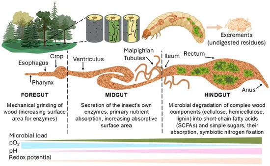 2.2. The Structure and Functions of the Digestive System of Xylophagous Insects: Adaptations to Wood Feeding