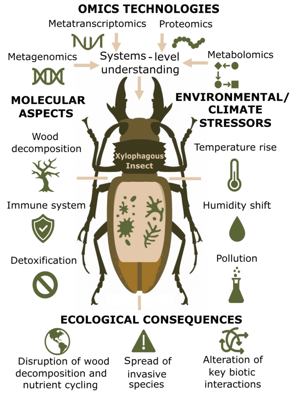 | Drought and Humidity Stress | In termites, flooding events led to a restructuring of gut microbial communities and a significant loss of cellulolytic activity. For bark beetles (Ips typographus), drought stress in host trees is associated with an enrichment of xerotolerant fungal symbionts in beetle galleries. | Gap: understanding of how gut microbiota helps insects maintain water balance and digest drier wood is limited. Approach: manipulate humidity in mesocosms, track microbiome dynamics via metatranscriptomics, and measure insect water retention and digestive efficiency. | [115,124] |