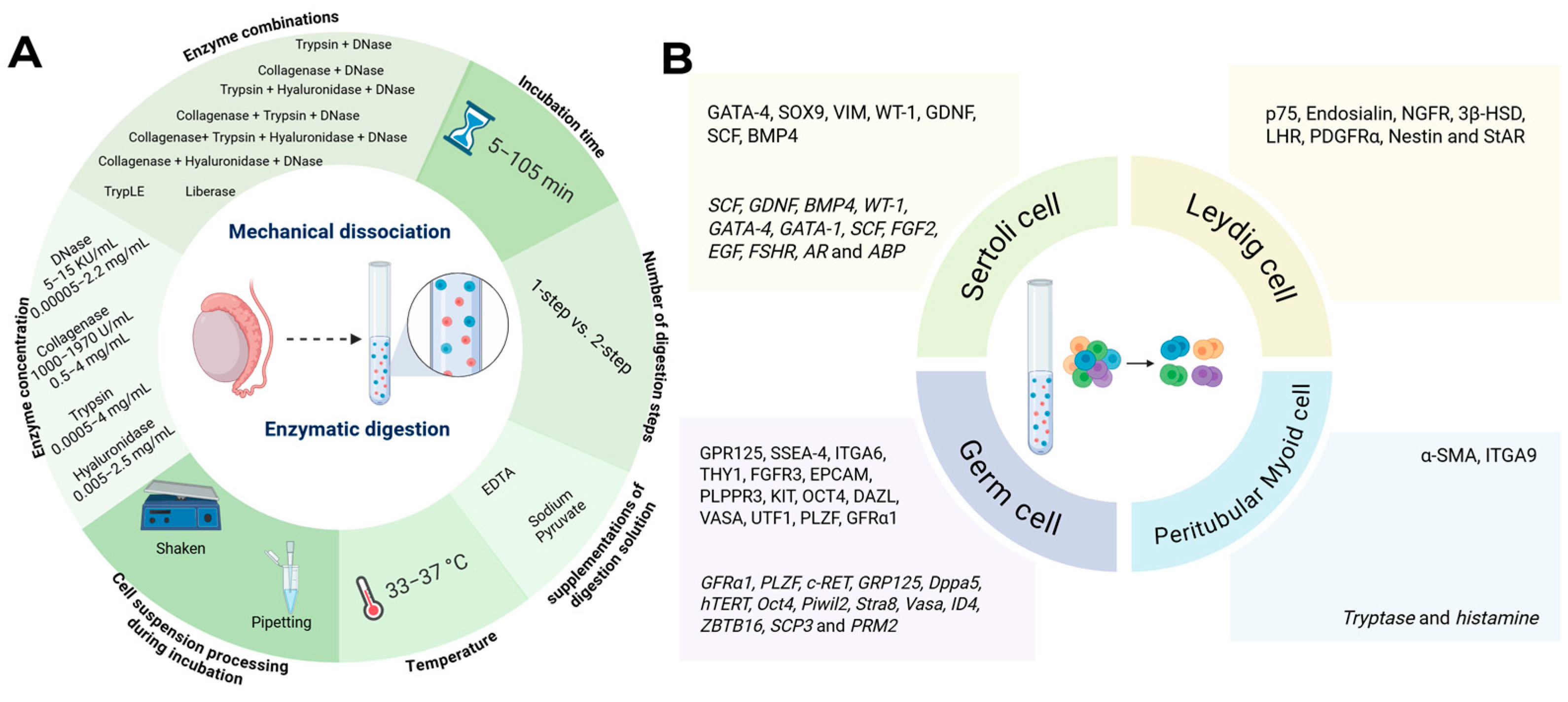 | Kossack et al., 2013 [56] | NA | Biopsy with normal spermatogenesis n = 4 Klinefelter patients n = 3 | Fresh | Step 1: 1 mg/mL collagenase IA at 37 °C for 30 min Centrifugation 438 × g for 5 min Remove supernatant Step 2: 4 mg/mL Trypsin + 2.2 mg/mL DNase I for 10 min at 37 °C | 2.91 ± 1.21 × 106 cell yield after digestion of normal spermatogenesis samples 2.87 ± 2.03 × 106 cell yield after digestion of Klinefelter patient samples |