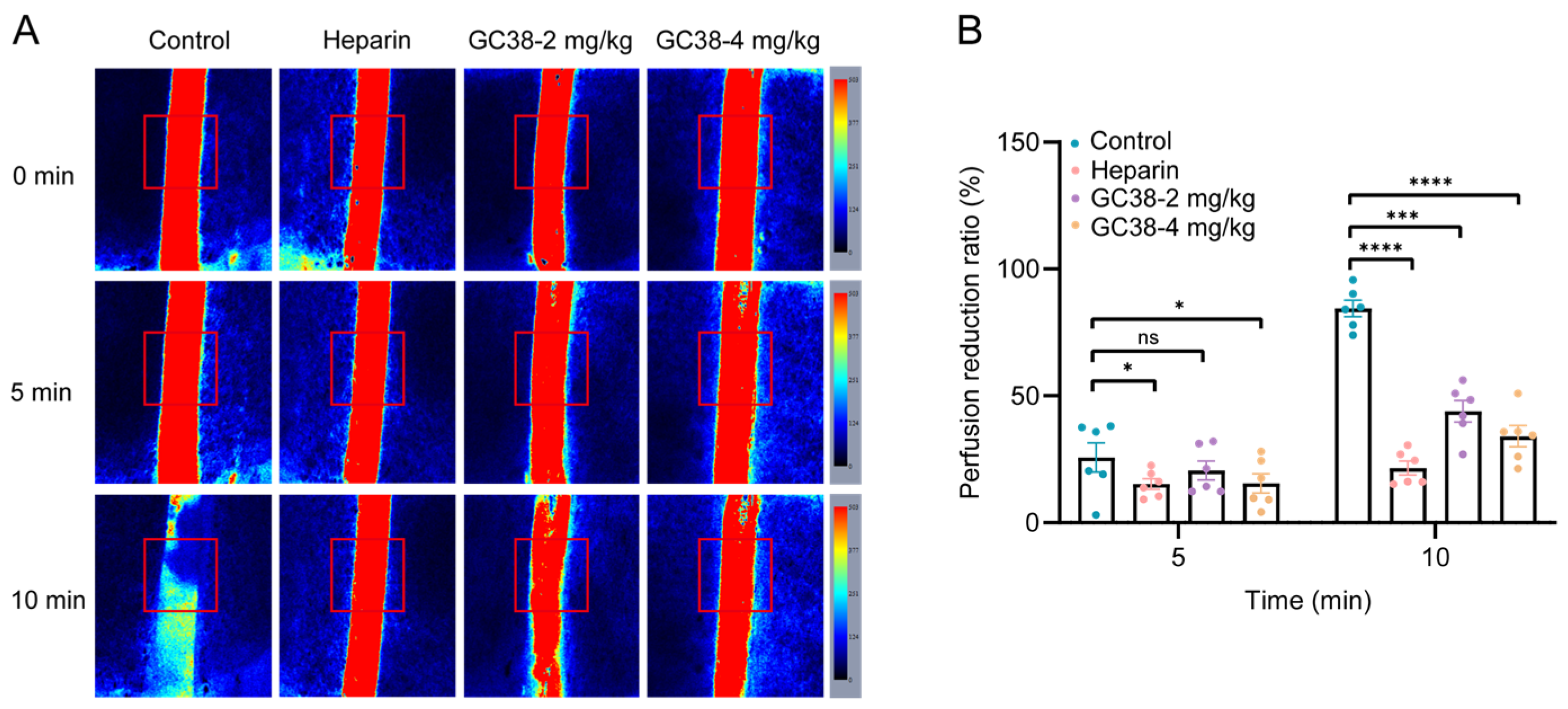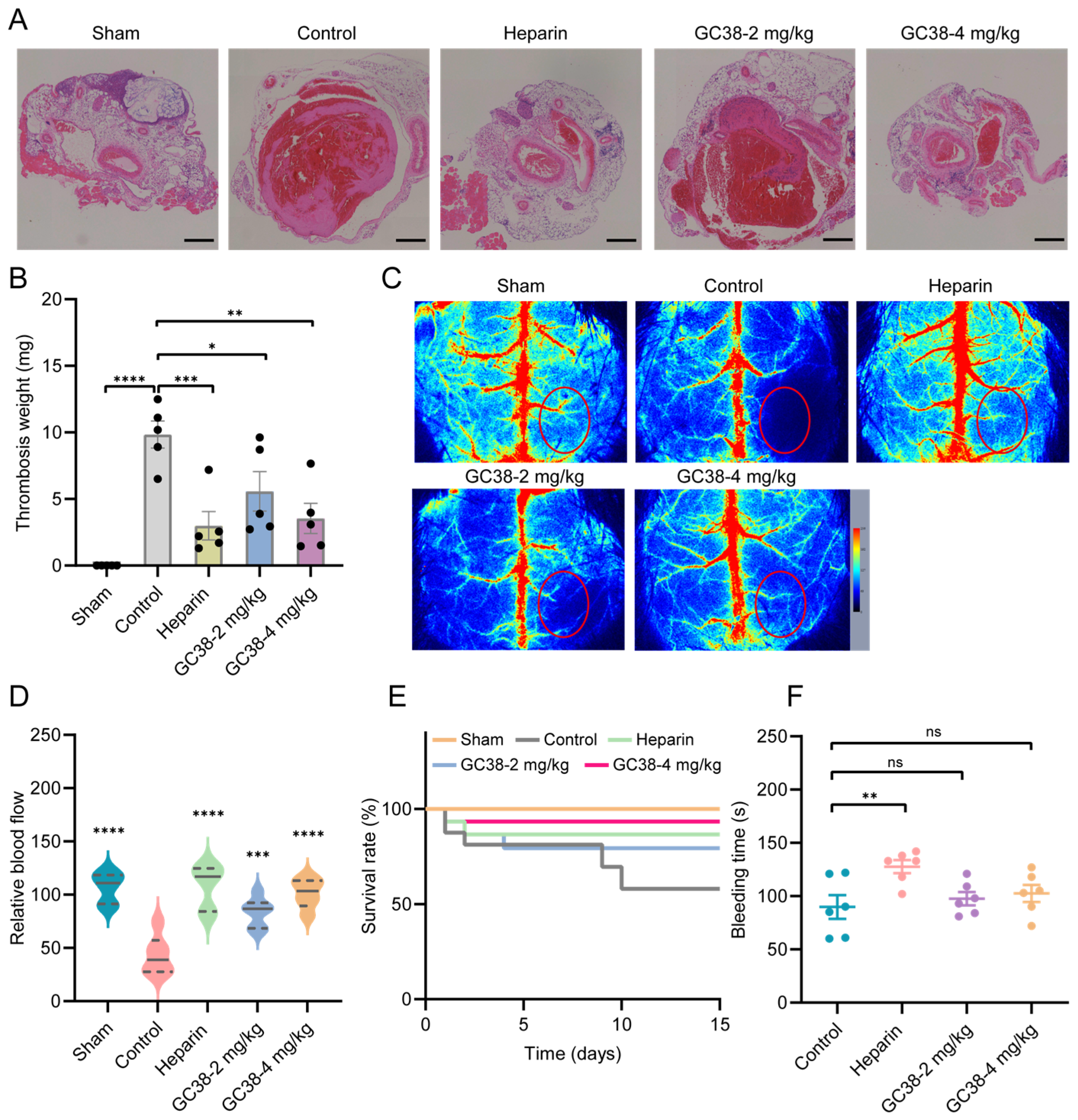 2.5.1. Antithrombotic and Anticoagulant Effects of GC38 in FeCl3-Induced Carotid Artery Thrombosis Model