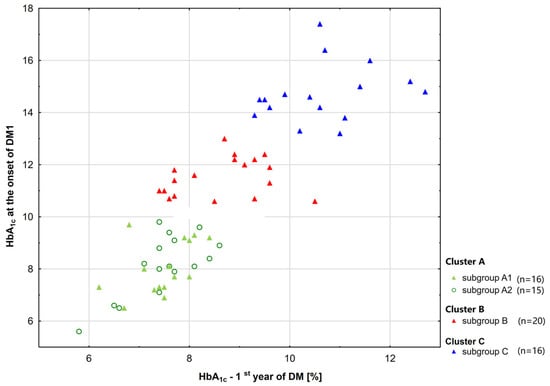 Initially, sixty-seven (67) patients with type 1 diabetes of Polish nationality, including 37 girls and 30 boys, participated in the study. Patients were divided into three groups based on their HbA1c levels at diagnosis and their average levels during the first and second years after diagnosis (see Figure 1). Our previous article, “The Impact of Metabolic Memory on Immune Profile in Young Patients with Uncomplicated Type 1 Diabetes,” provided a detailed description of this process [].